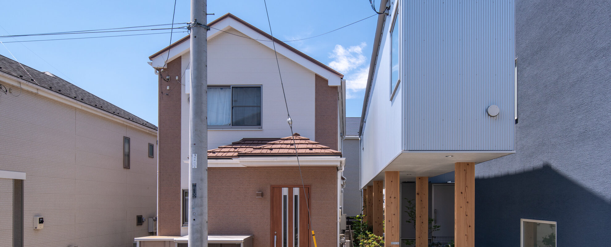 計画地は高低差のある敷地であったため、その地形条件を無理に均すのではなく、土地の傾斜を生かしたスキップフロア構成を採用しています。これにより、建物全体に立体的な広がりが生まれ、住宅地の中にありながらも、街に対して開かれた表情を持つ建築となりました。