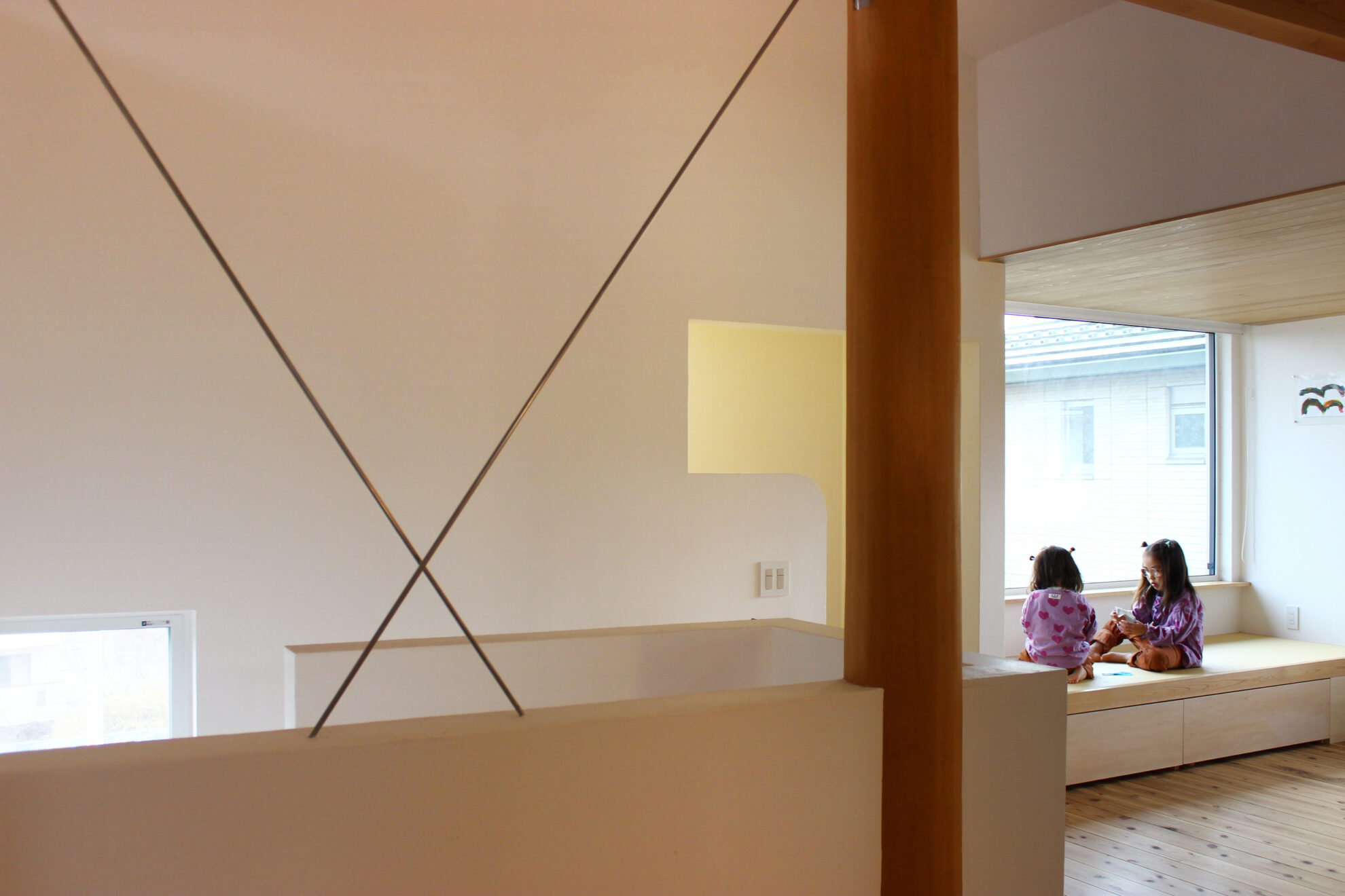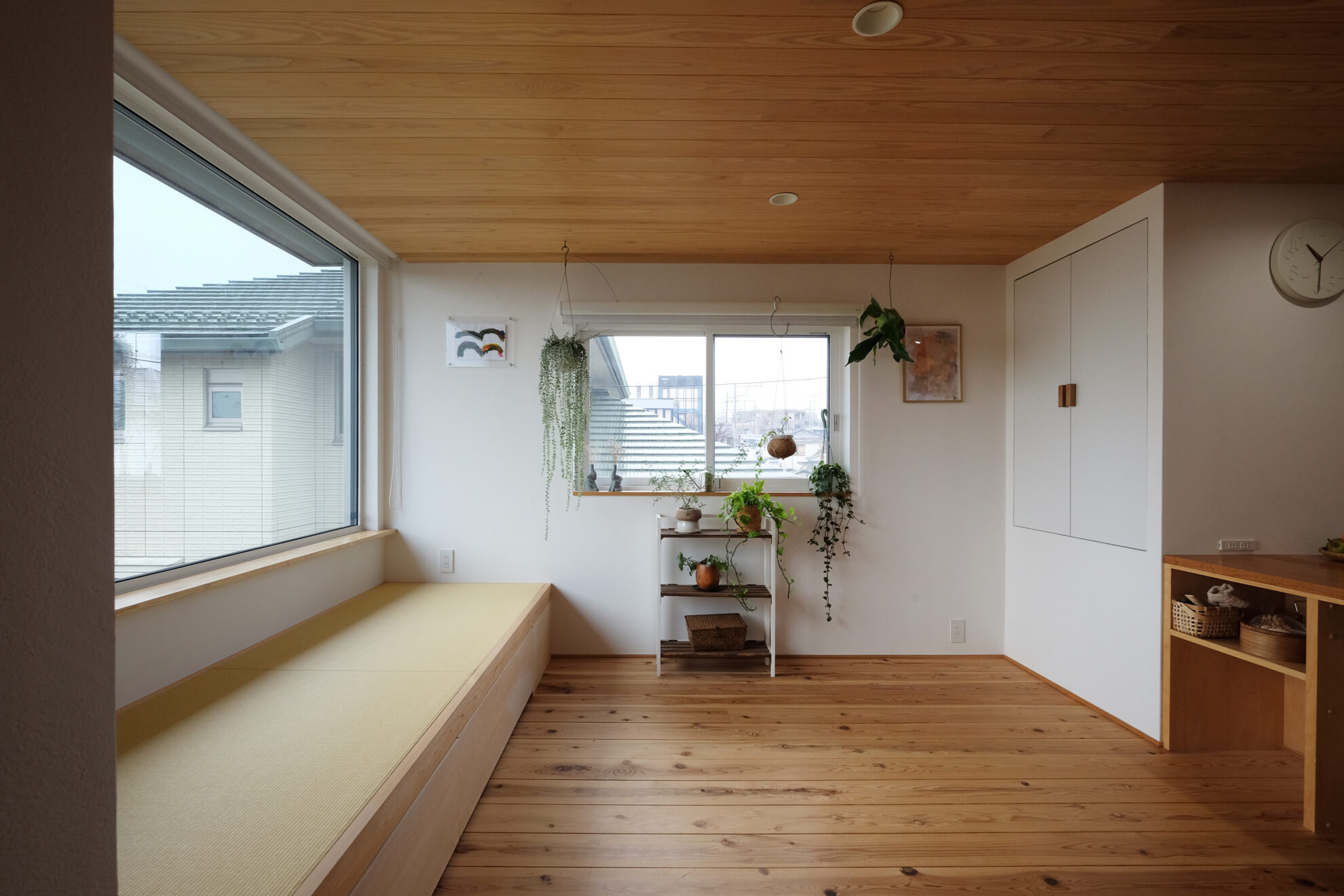 2階のリビングで一番の借景が望める筑波山の方角には、眺望が楽しめる大きな窓と小上がりを設けています。