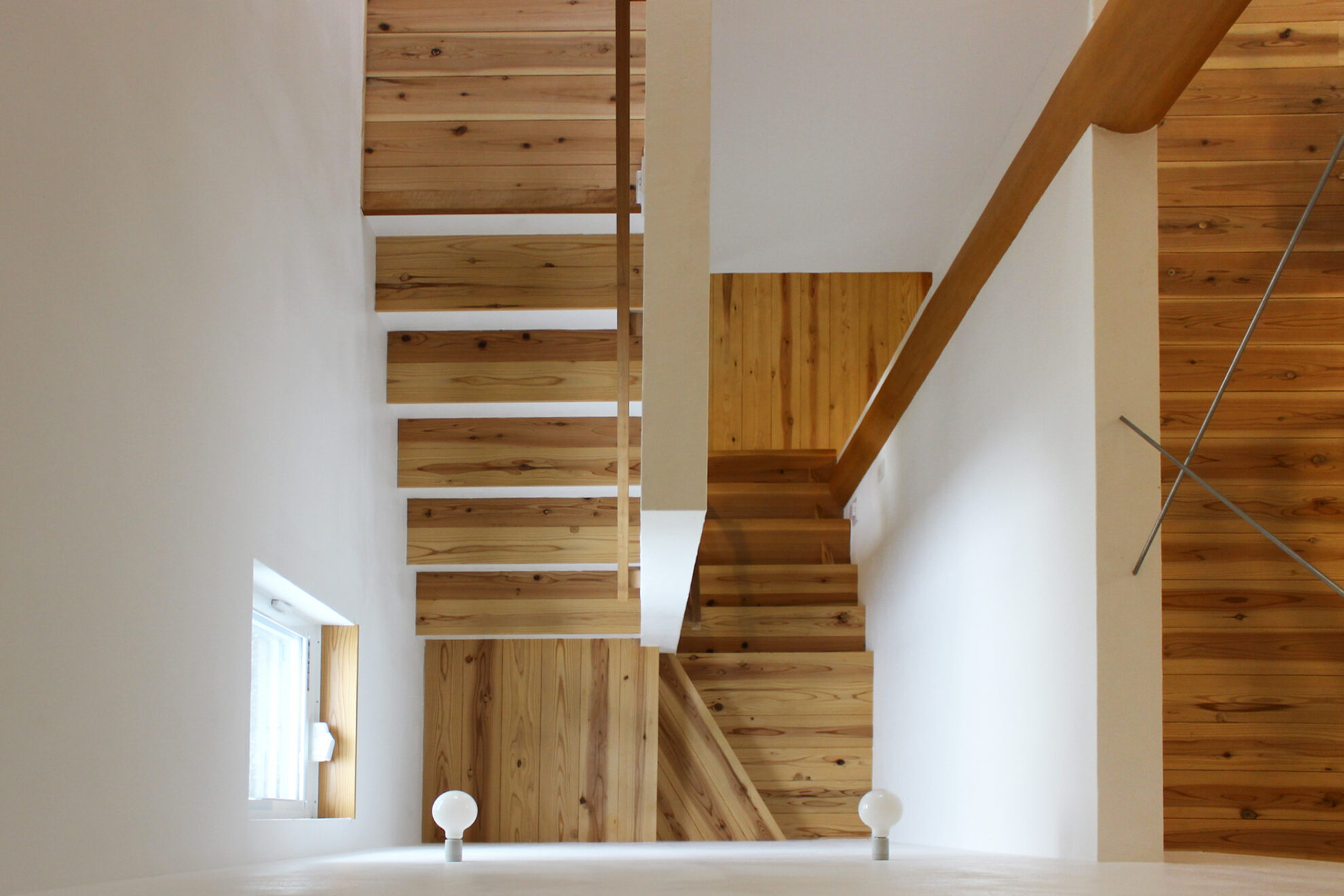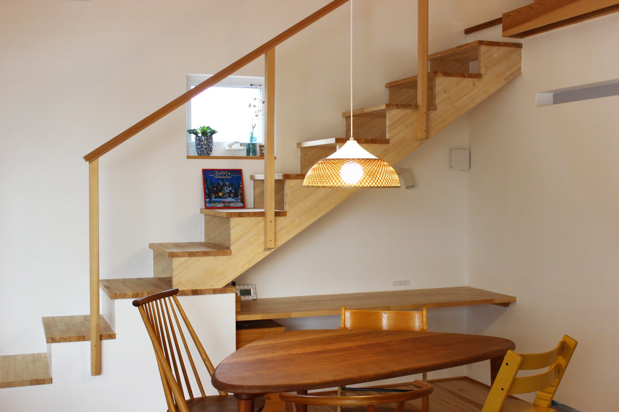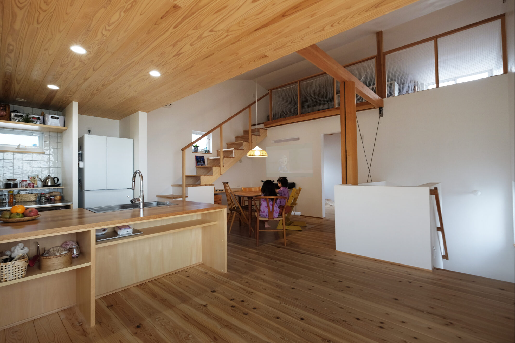 天井の高さには強弱をつけ、最低限の2.1mとして落ち着く空間がありつつ、4mの吹抜けによる開放感も感じられる空間になっています。リビング脇の階段は、その吹抜けを通って、リビングを見下ろすことができるロフトへとつながります。