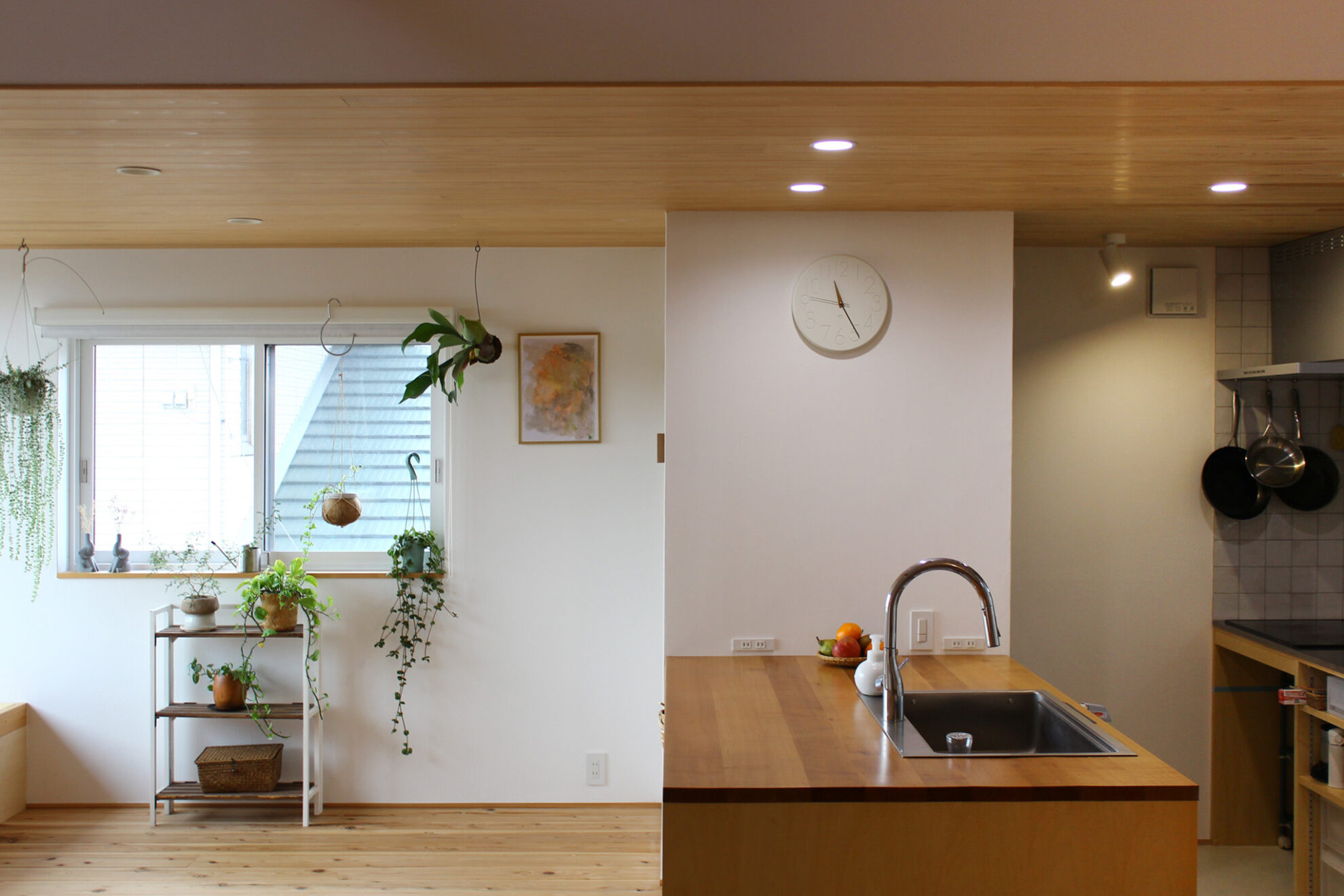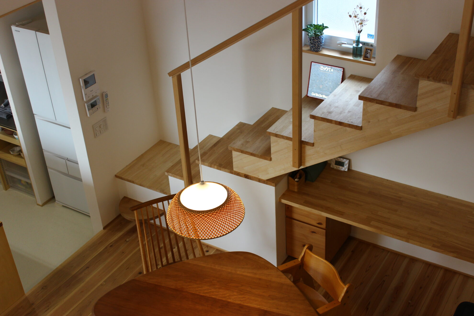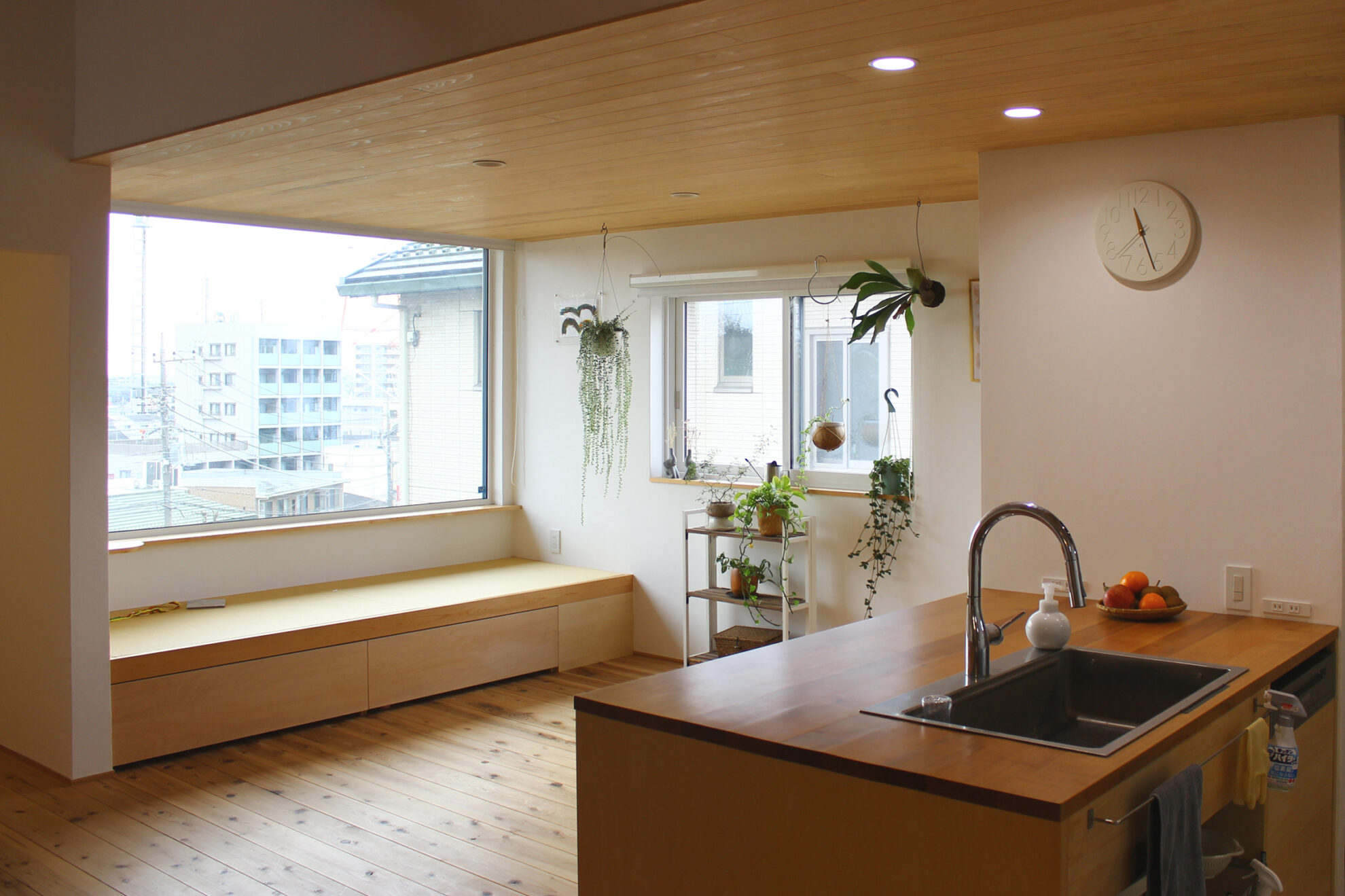 キッチンはすべて造作で、建て主さまの要望が詰め込まれています。リビングで「座る家族」の目線とキッチンに「立つ家族」の目線が近づくよう、キッチンの床はリビングよりも少し低くしています。