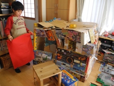 散かりを気にしながらも、お母さんは百円ショップで仕入れた布を渡しています。洸太君には何かひらめいたのでしょう。顔が生き生きしています。