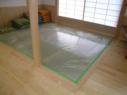 見学会の準備で畳を汚さないようにビニールで養生したところ、そのビニールが膨らんできました。
