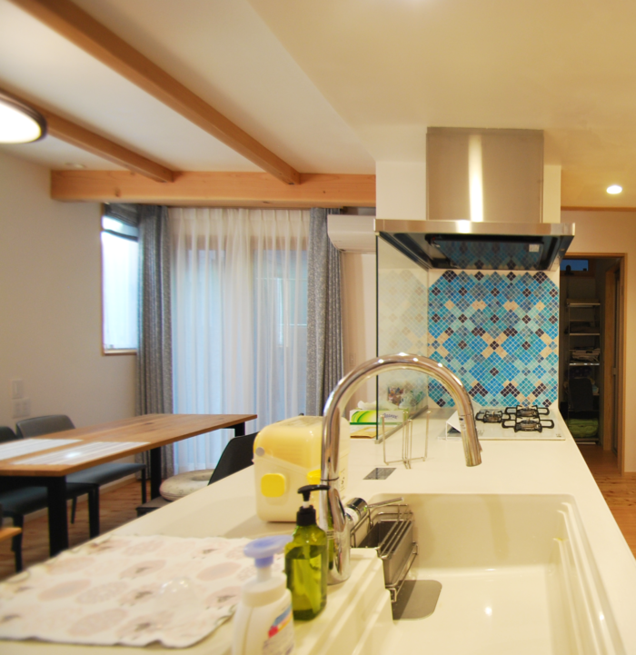 1階LDKはコンパクトな空間ですが、キッチン側を家事動線としていることで、